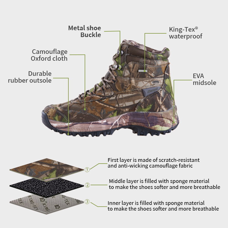 ①Primul strat este realizat din țesătură de camuflaj rezistentă la zgârieturi și anti-flux. ②Stratul mijlociu este umplut cu material burete pentru a face pantofii mai moi și mai respirabili. ③Stratul interior este umplut cu material burete pentru a face pantofii mai moi și mai respirabili.
