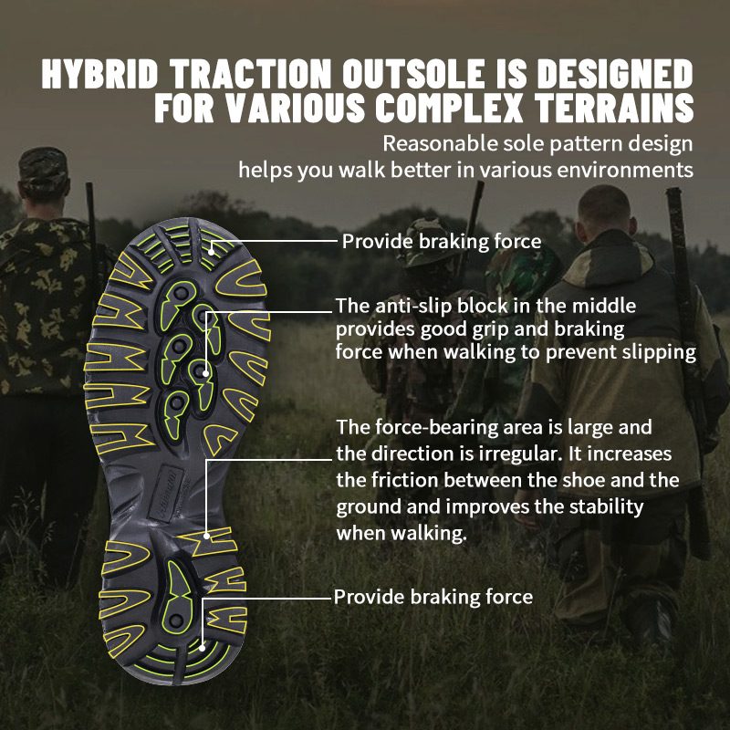 ①Blanțul Poliyou cu elasticitate ridicată, care elimină umezeala, menține interiorul uscat. ②Talpă intermediară EVA, învelită în pânză de camuflaj, amortizare și absorbție a șocurilor. ③Talpă exterioară din cauciuc durabilă, anti-alunecare și rezistentă la uzură.