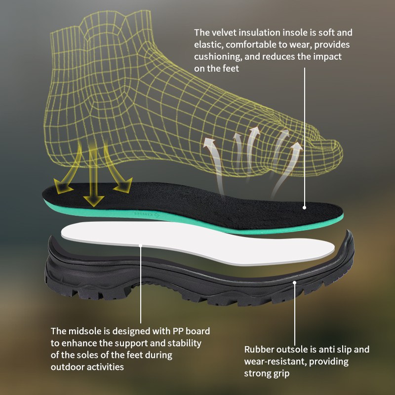 ① Căptușeală de catifea. Moale sub picioare. Absorb impactul. ②Talpă intermediară PP pentru suport stabil. ③Talpă din cauciuc care nu se lasă. Prinde, durează, rămâne fiabil.