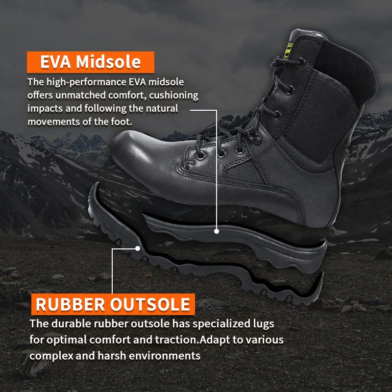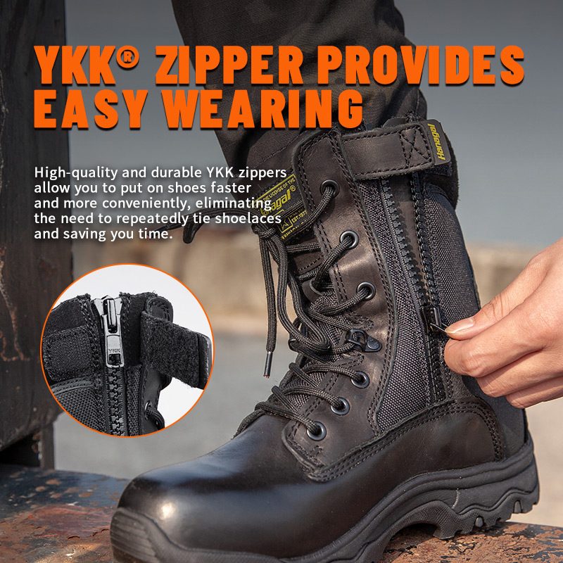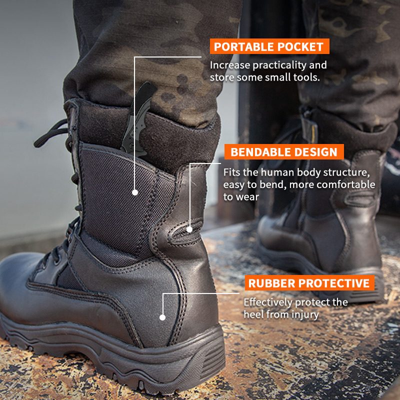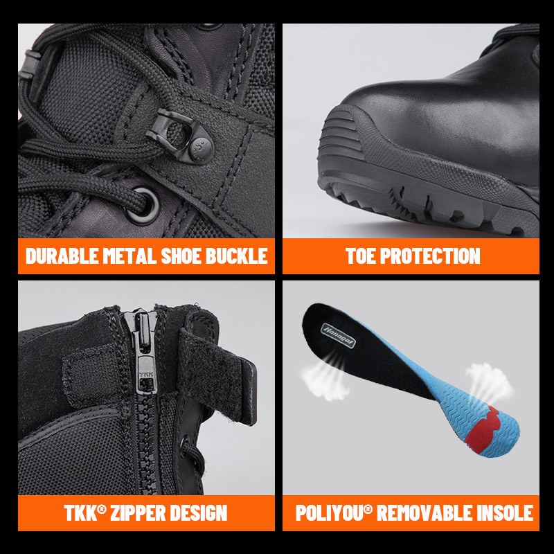 Aceste cizme de poliție din piele integrală cu fermoar YKK sunt disponibile pentru personalizare în culori, materiale și detalii, cu MOQ de 800 de perechi, ideale pentru colaborări cu mărci și achiziții în grup. Și aceste cizme de vânătoare au următoarele avantaje: